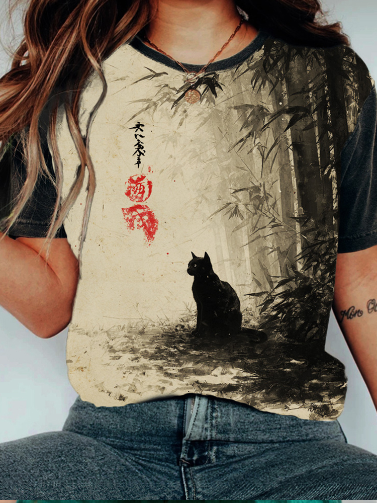Bamboo Forest Lonely Shadow Cat Lady Short-sleeved Round-neck Top