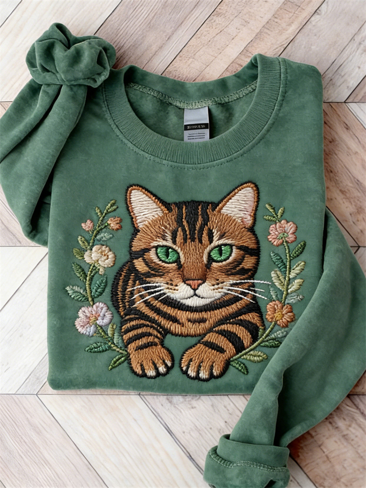 Lovely Tabby Cat Floral Art Washed Cozy Sweatshirt