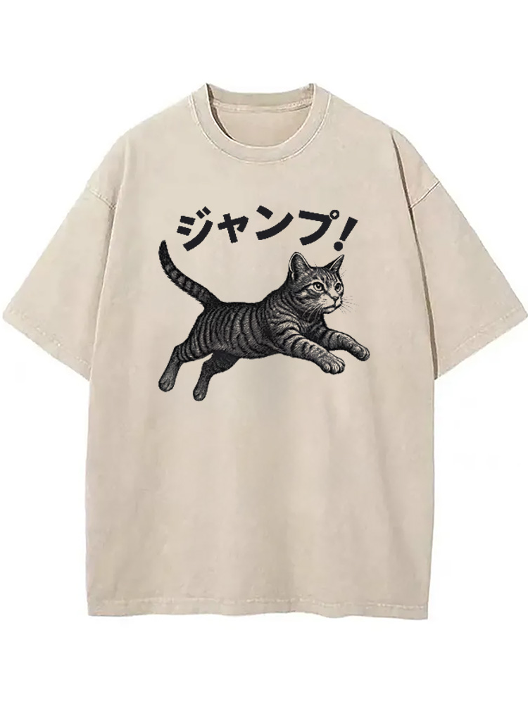 Jumping Tabby Funny Japanese Cat Washed T-shirt