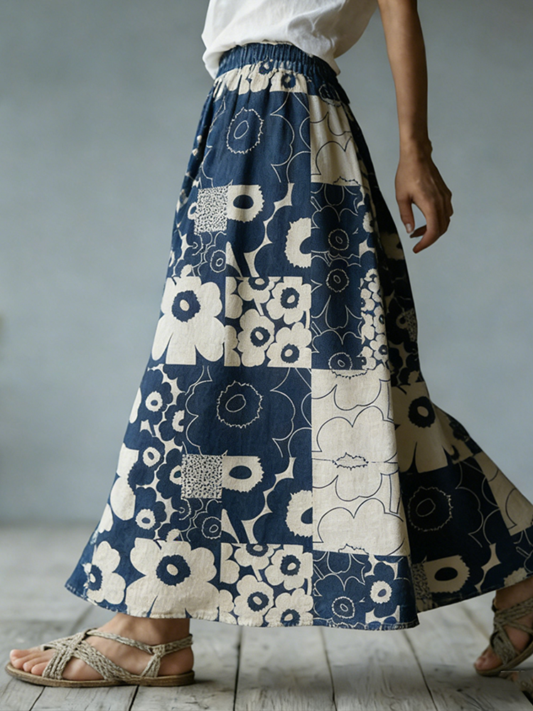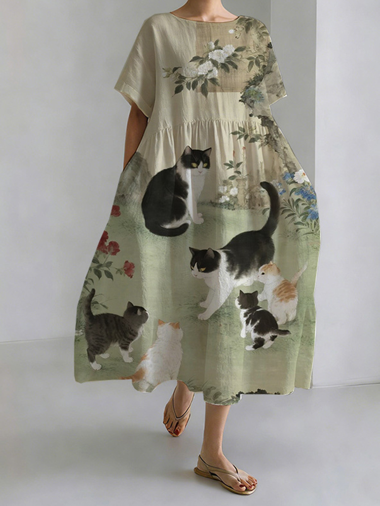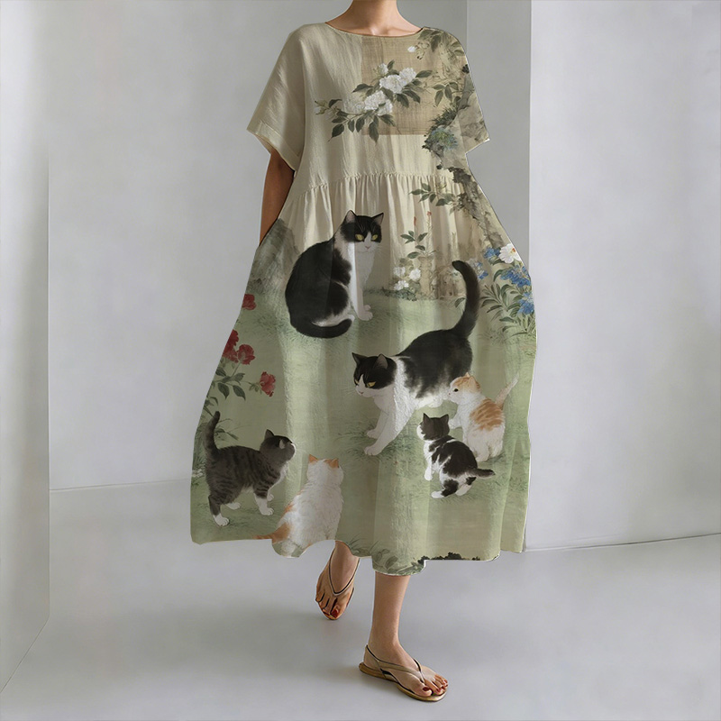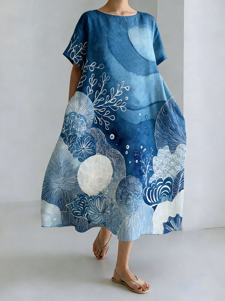 Women's Japanese Ink Painting Style Ocean Plant Pattern Comfortable Dress