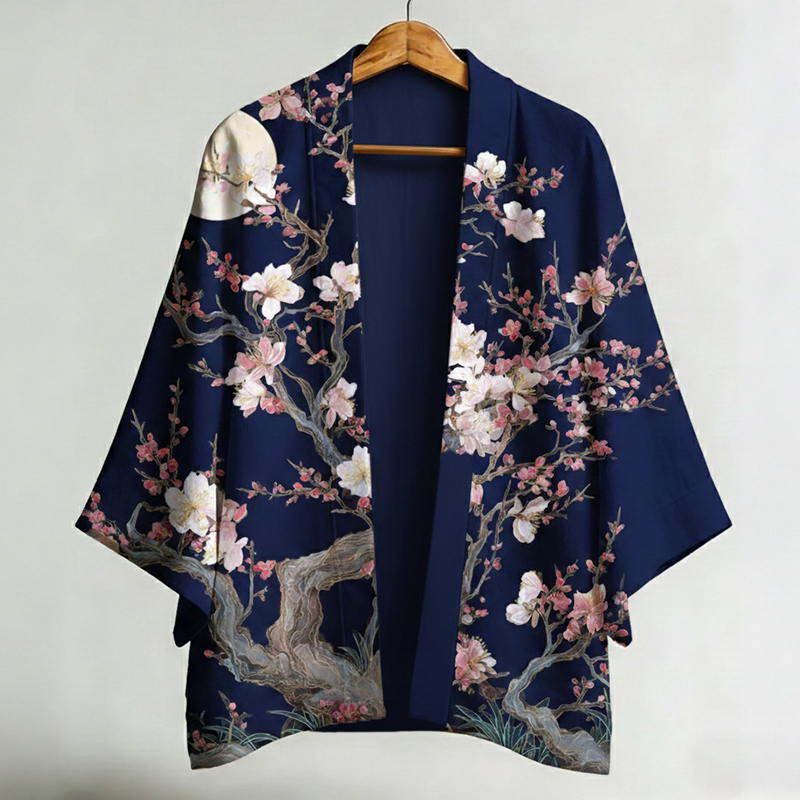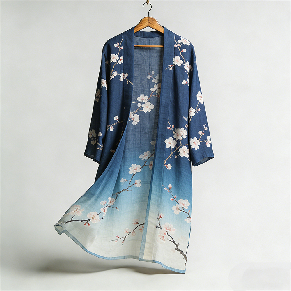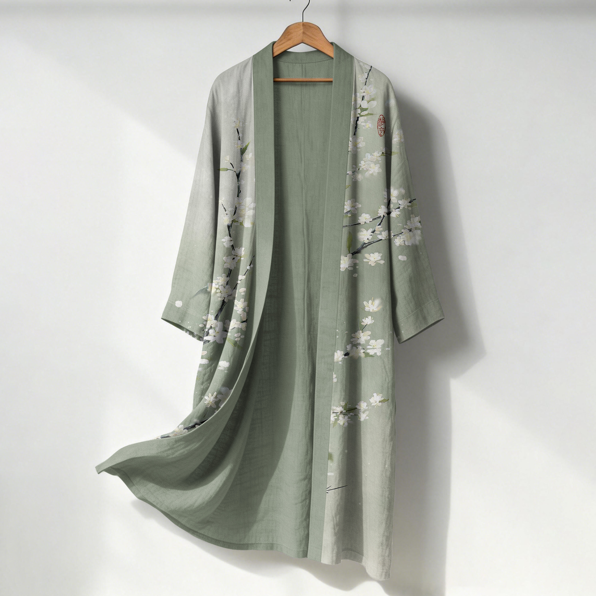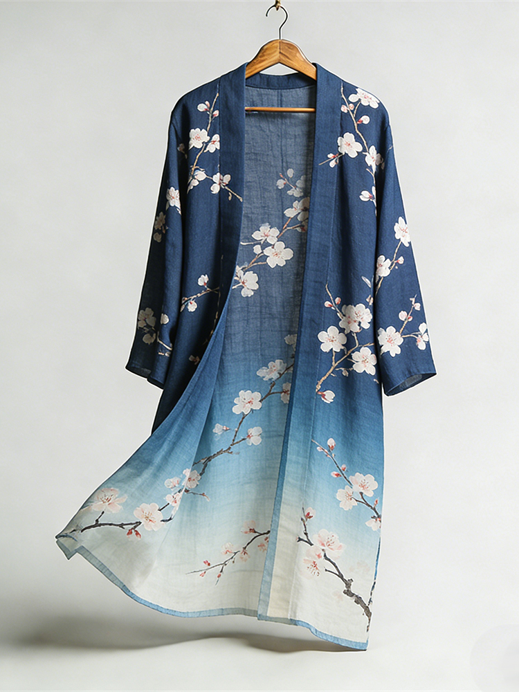 Japanese Apricot Blossom Pattern Linen Gradient Linen Long Kimono