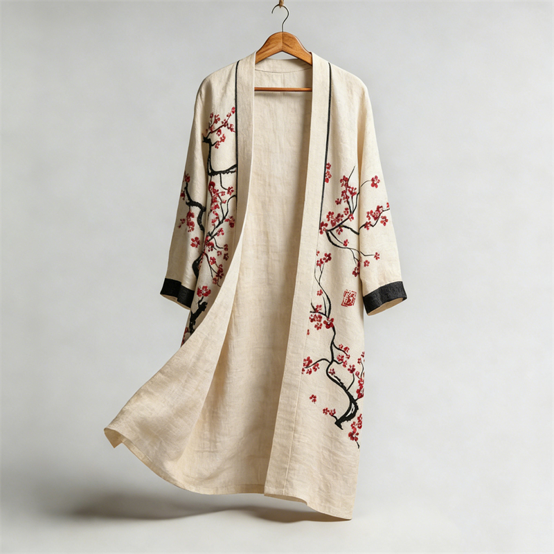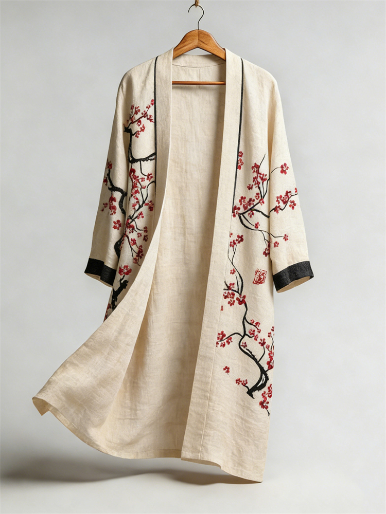 Japanese Plum Blossom Brush Art Flowy Linen Long Kimono