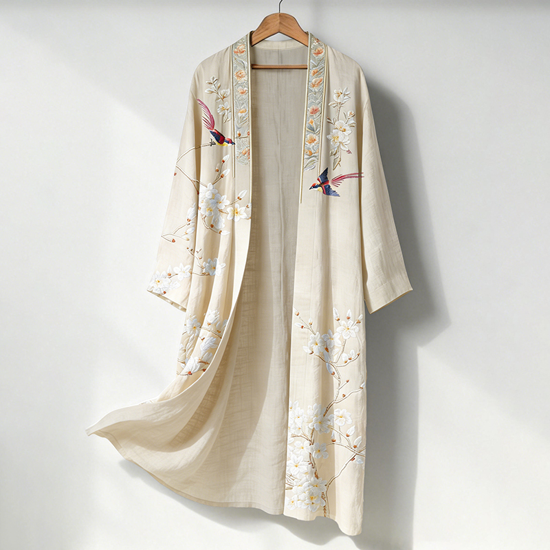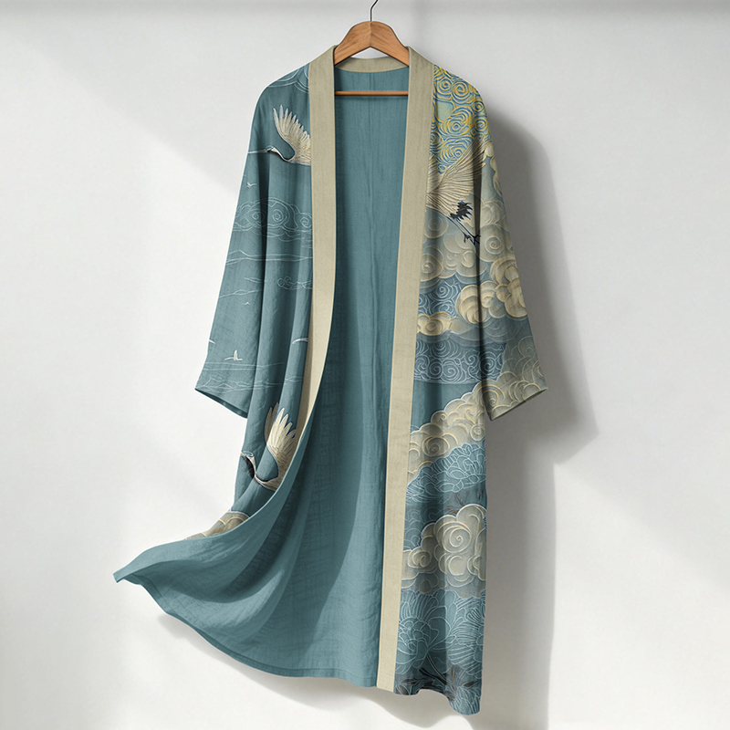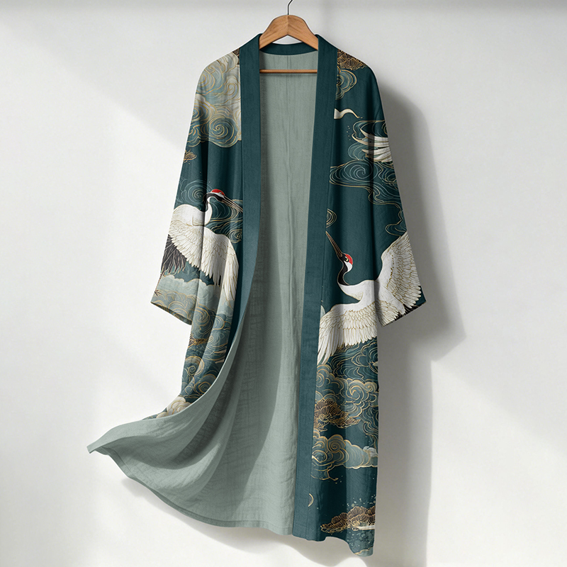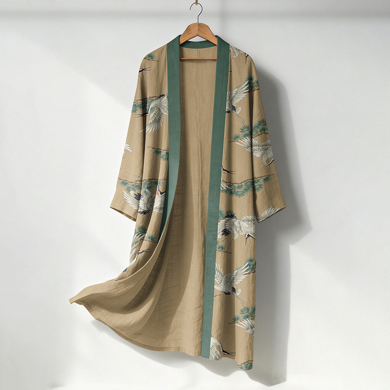 Japanese Crane Floral Lino Art Flowy Long Linen Kimono