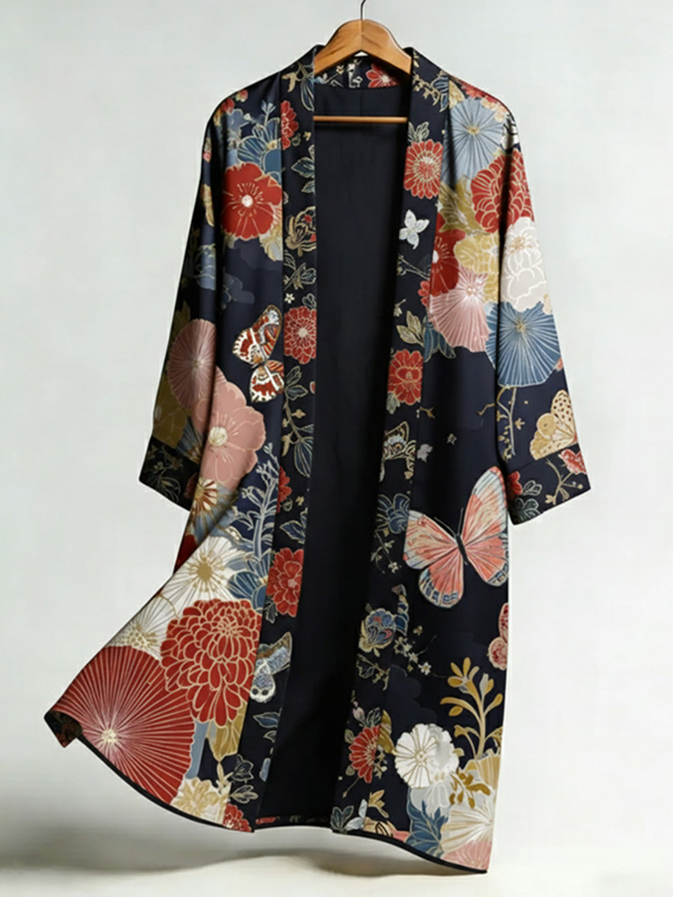 Women's Japanese Floral And Butterfly Print Long Kimono