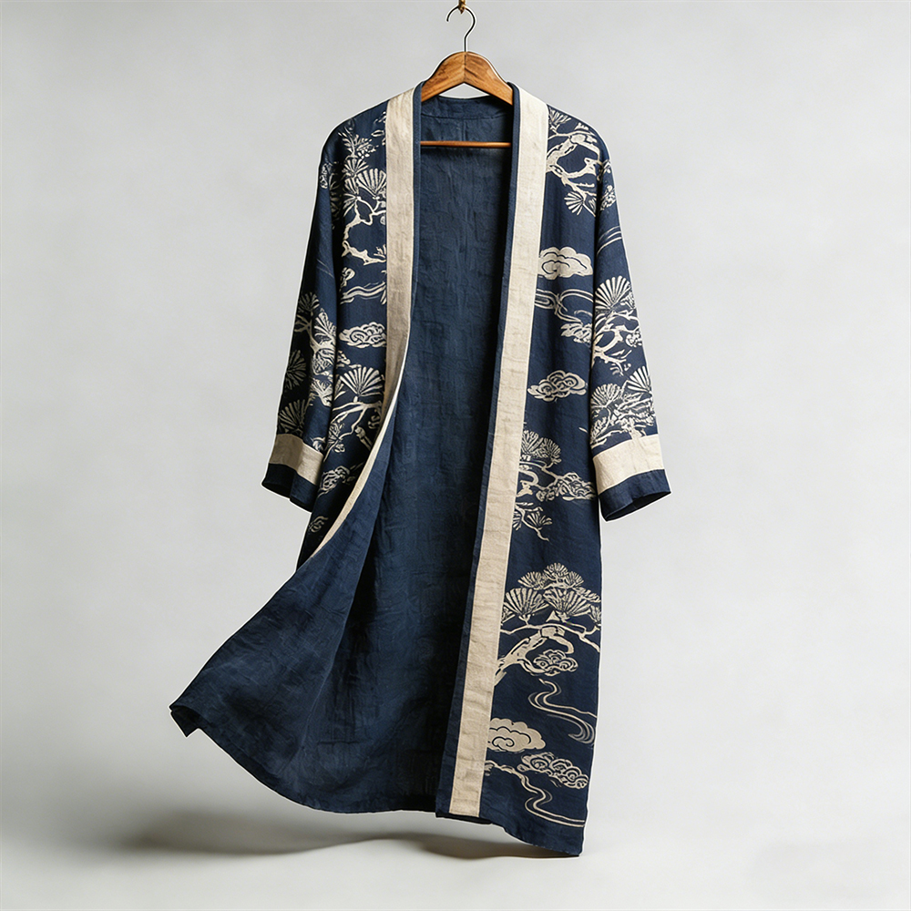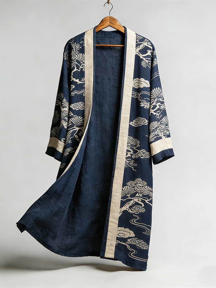 Japanese Pine And Cloud Pattern Linen Flowing Linen Long Kimono