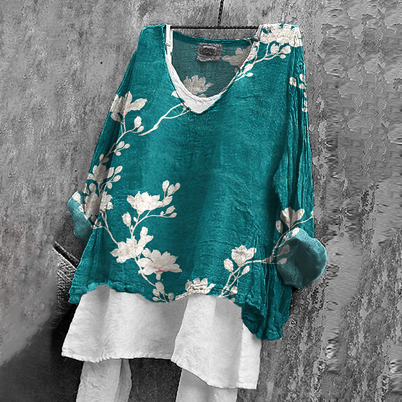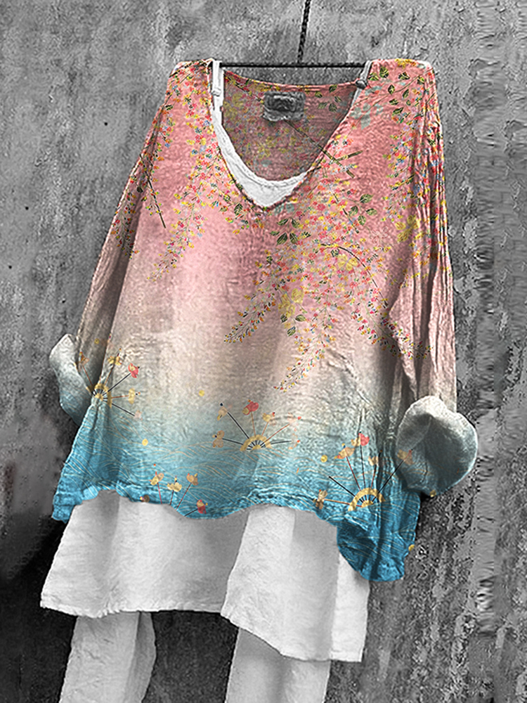 Women's Japanese Floral Gradient Art V-neck Linen Blend T-shirt
