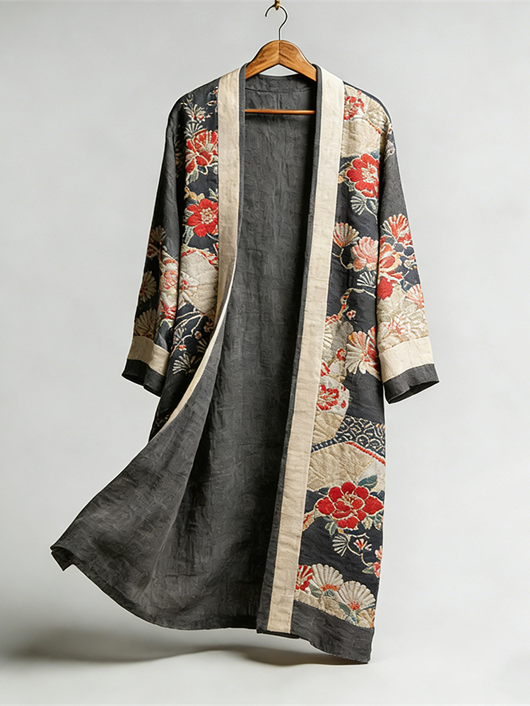 Japanese Floral Pattern Linen Flowing Linen Long Kimono