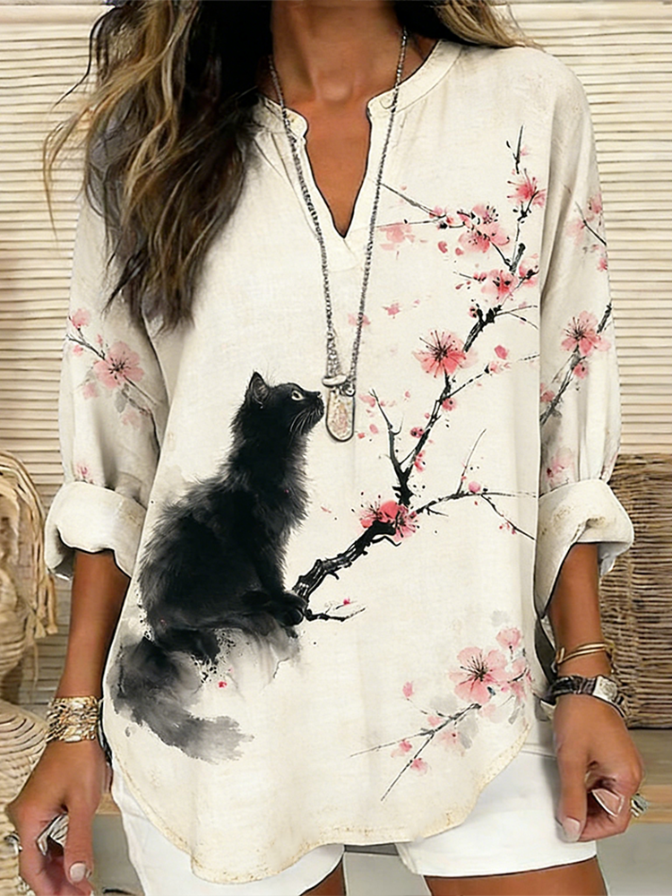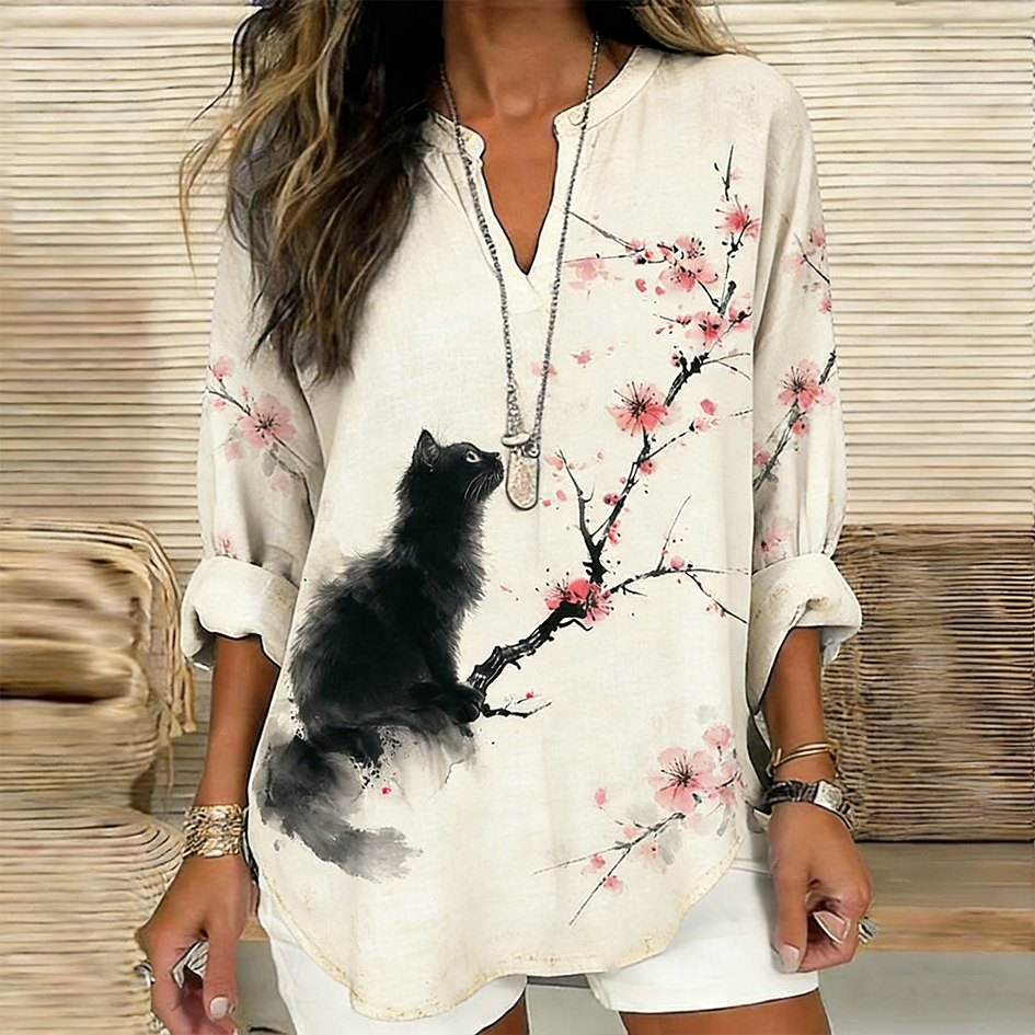 Japanese Art Retro Cat And Flower Pattern Women's Top
