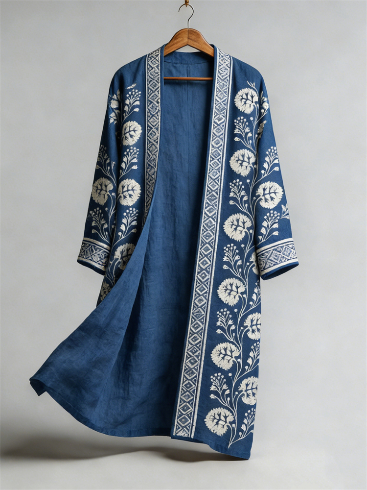 Japanese Floral Lino Art Flowy Long Linen Kimono