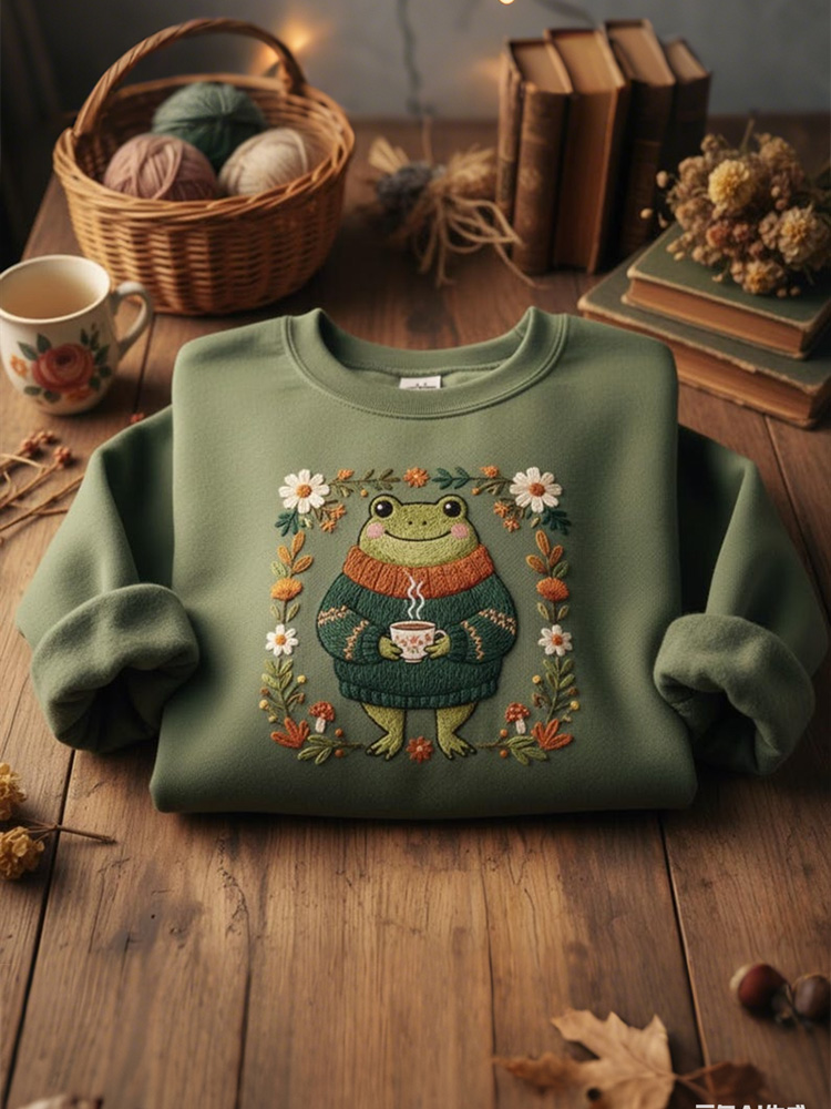 Cozy Frog With Tea Embroidered Shirt Cottagecore Folk Art Sweatshirt