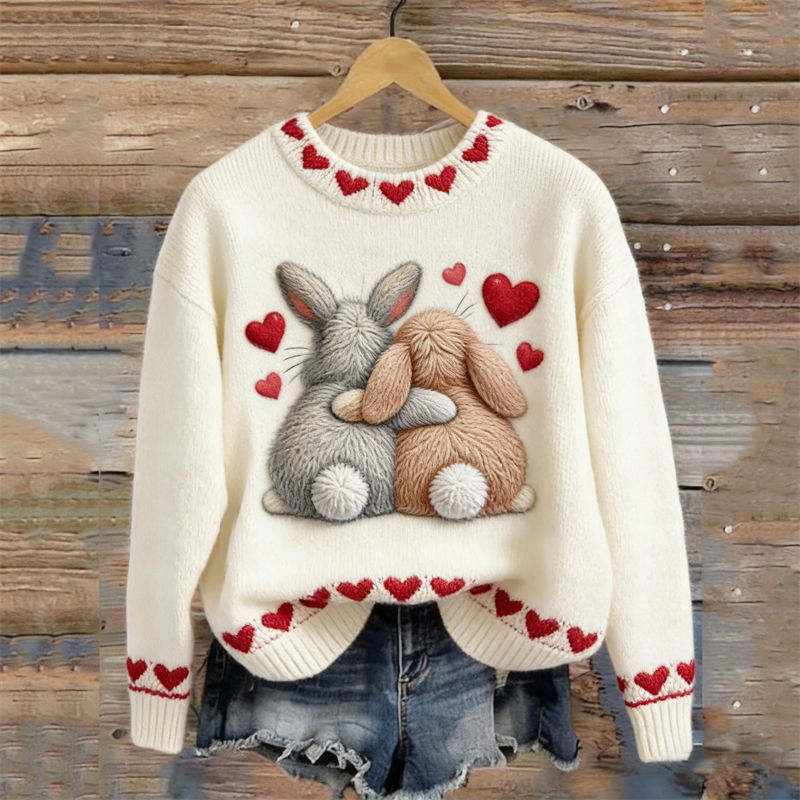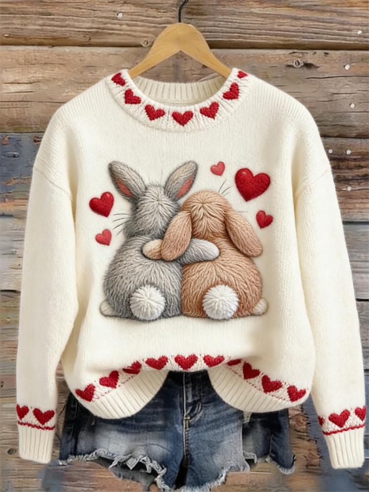 Cute Bunny Embroidery Art Cozy Knit Sweater