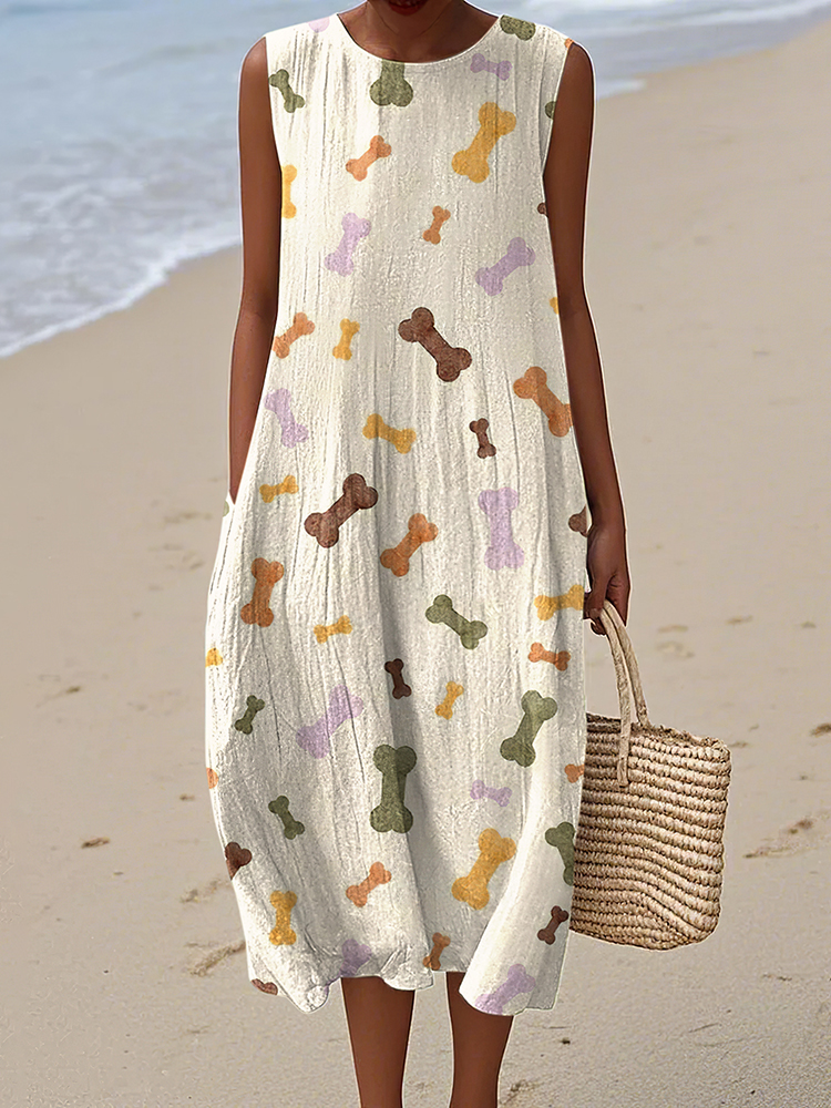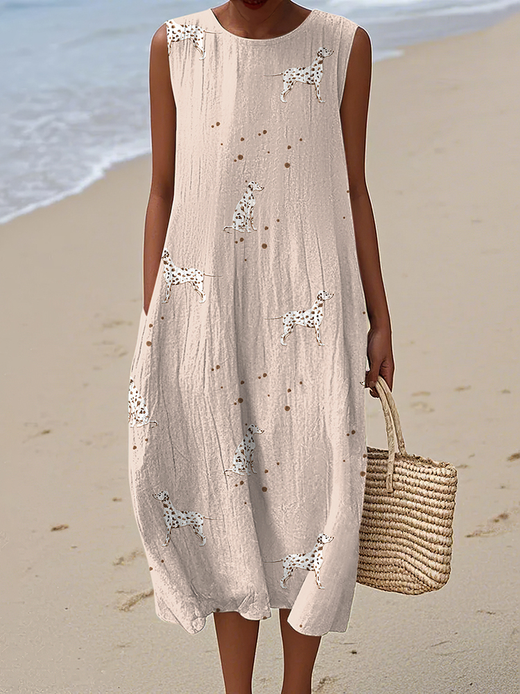 Retro Cute Dog Prints Linen Tank Midi Dress