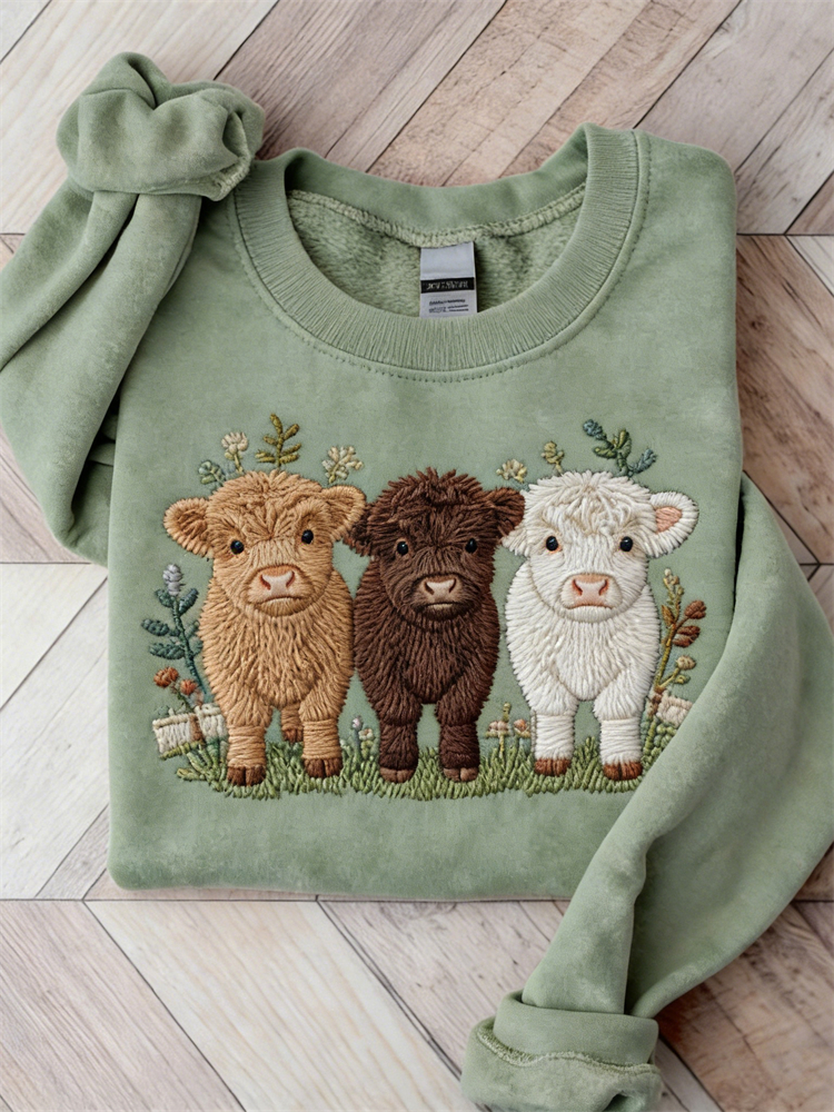 Highland Cow & Snow Embroidered Cozy Plush Sweatshirt