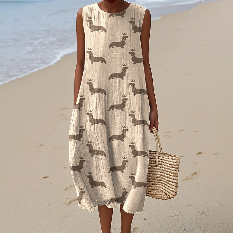 Women's Retro Cute Dachshund Dog Art Linen Tank Midi Dress