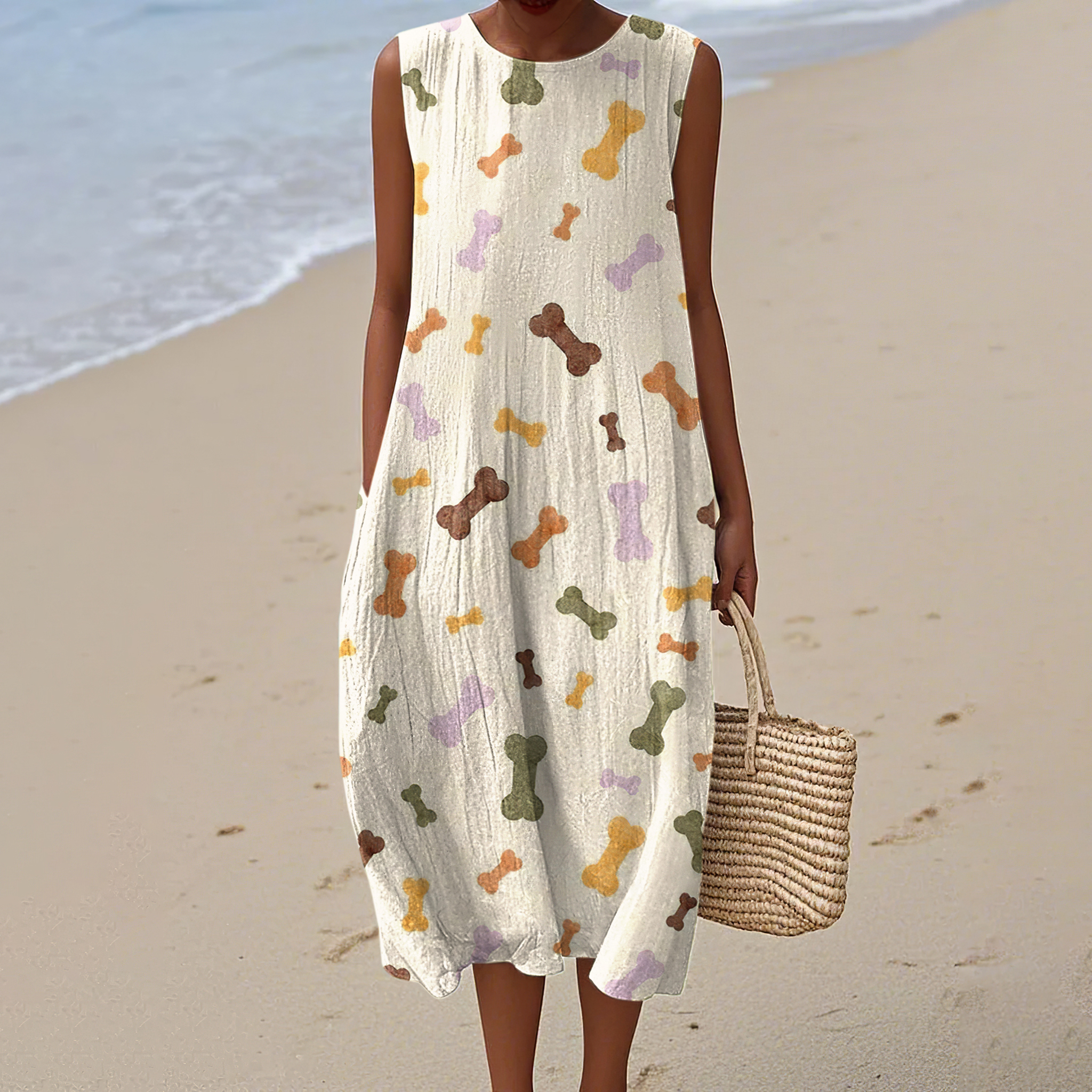 Women's Bone Print Linen Blend Tank Midi Dress