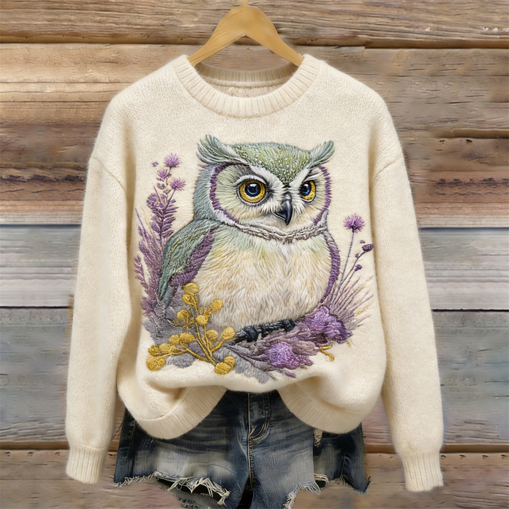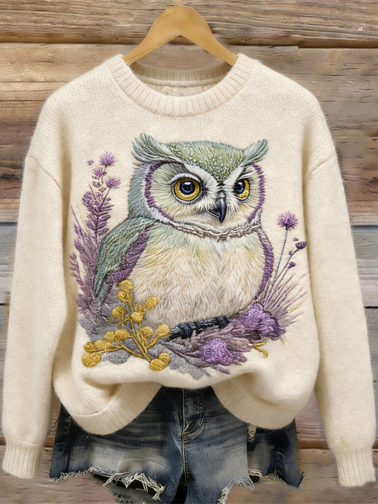 Forest Flower & Owl Pattern Crew Neck Knit Sweater
