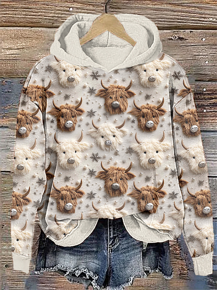 Highland Cow & Christmas Snowflake Casual Cozy Hoodie