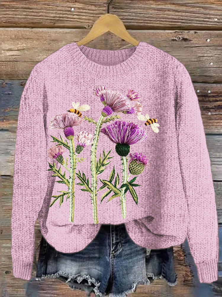 Scottish Thistle Flower Embroidery Women's Knit Sweater