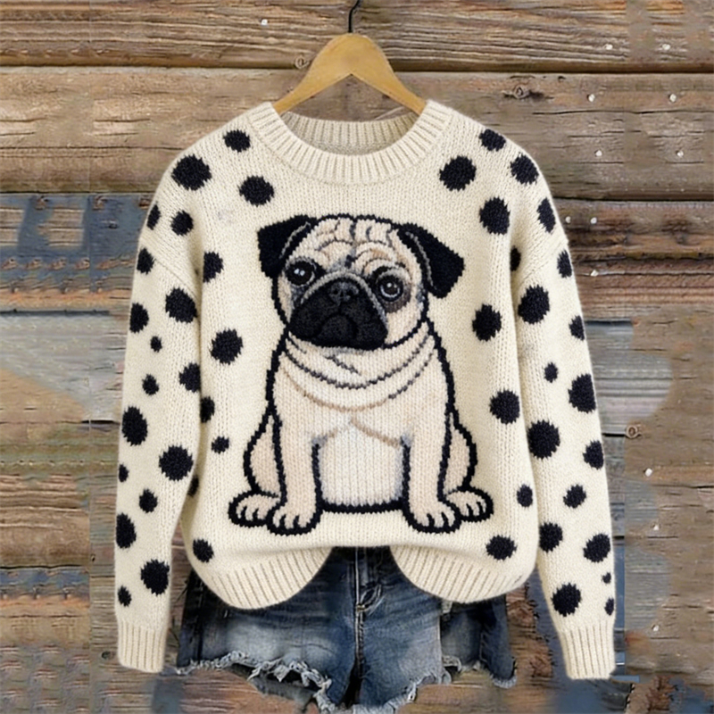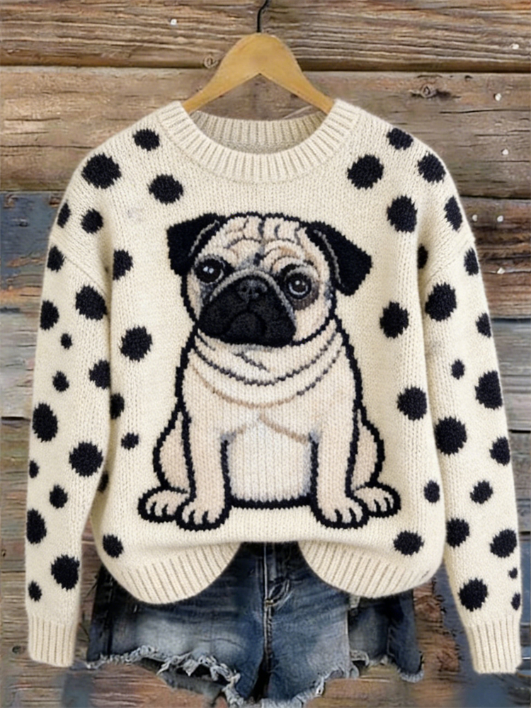 Lovely Pug Dog Polka Dots Cozy Knit Sweater