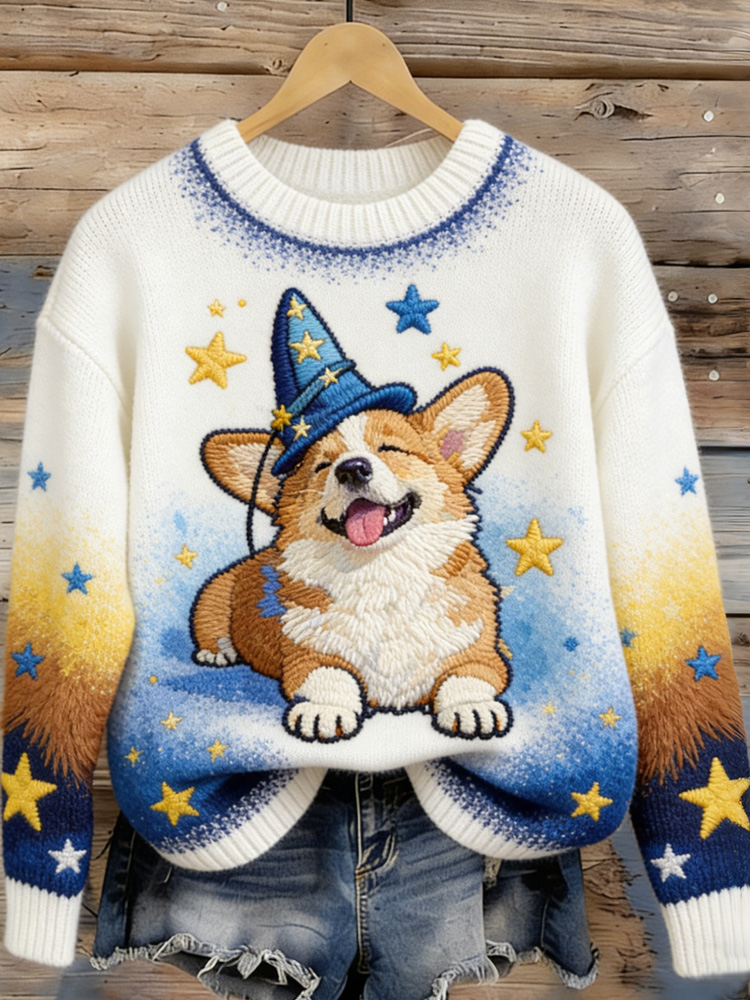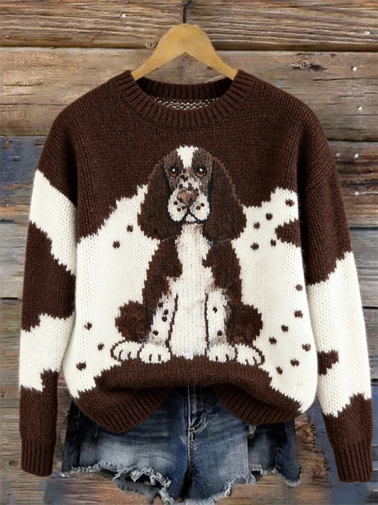 Lovely Dog Art Round Neck Cozy Knit Sweater