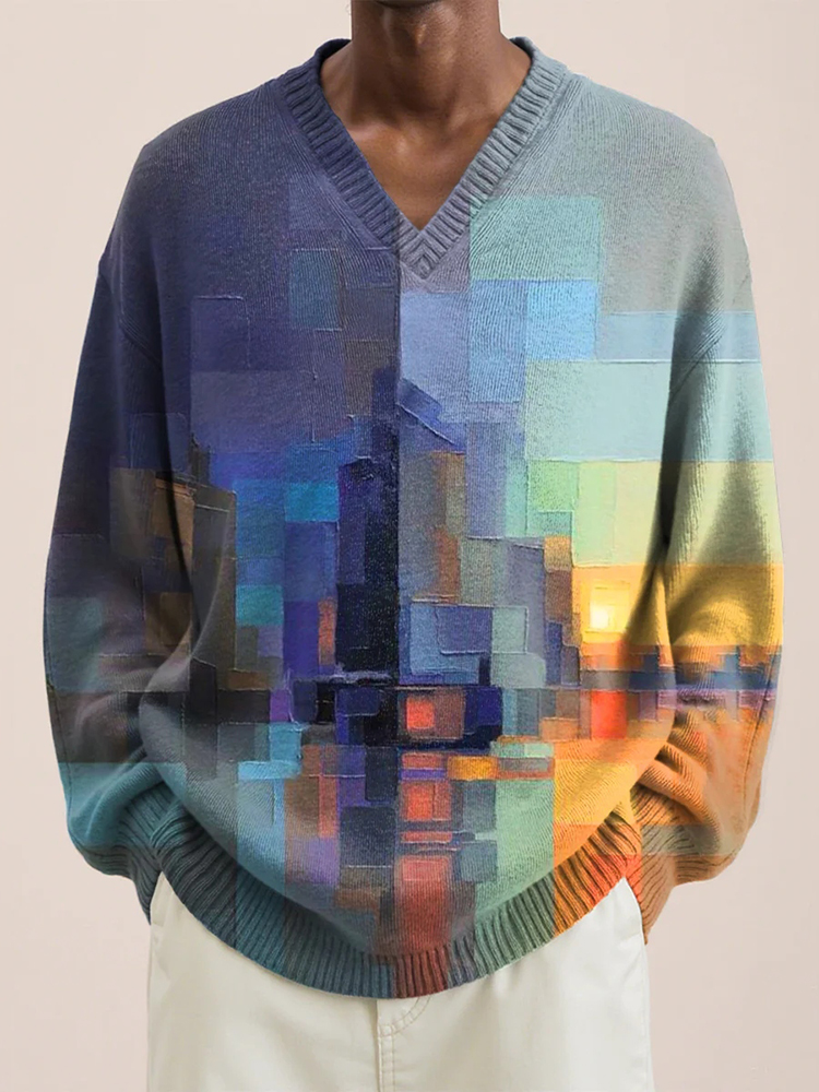 Men's Multicolored Abstract Art Print V-neck Lnit Long Sleeve Sweater