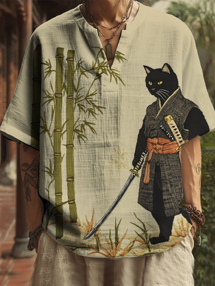 Men's Japanese Black Cat Swordsman Bamboo Embroidery Print Casual V Neck Shirt