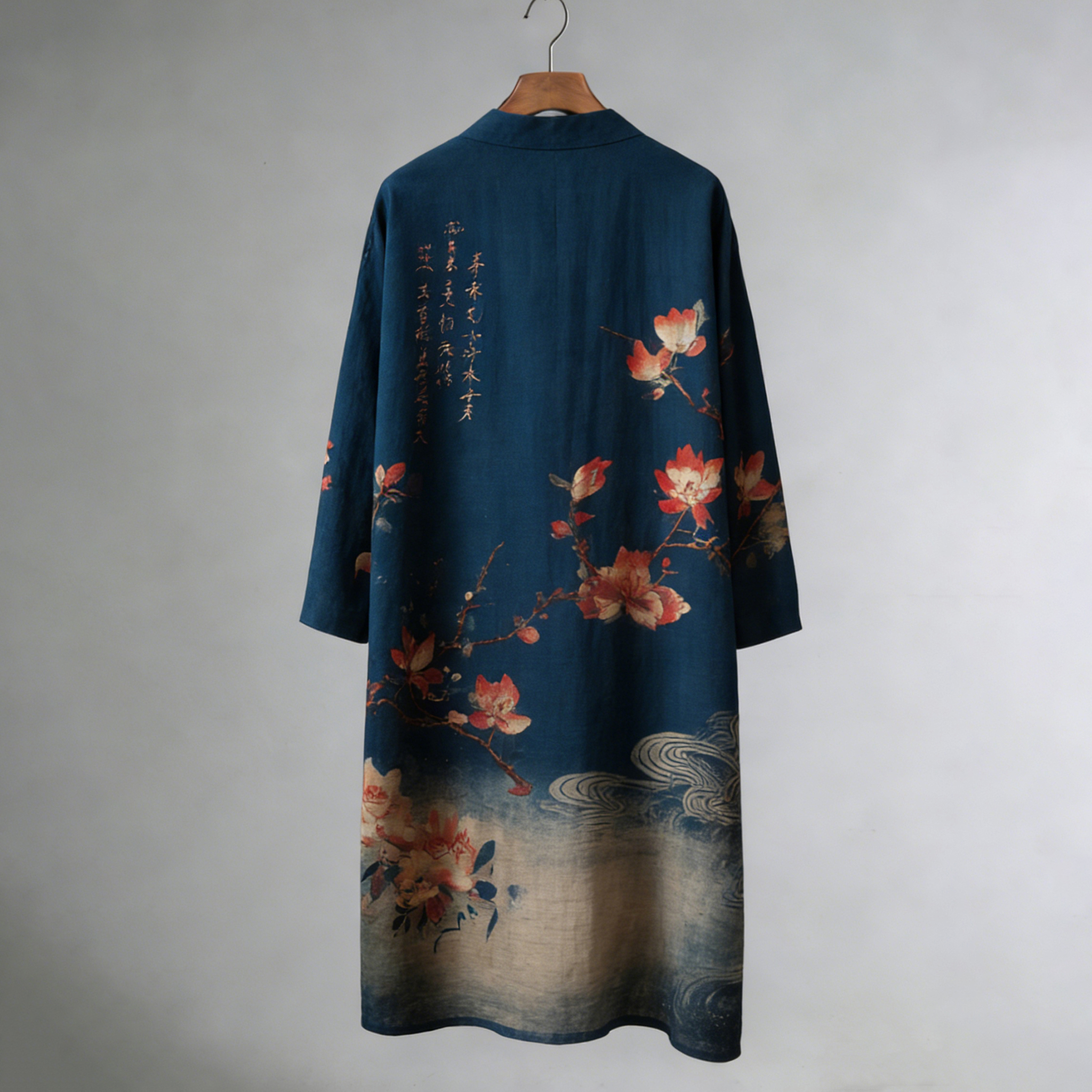 Japanese Floral And Calligraphy Pattern Linen Blend Long Kimono
