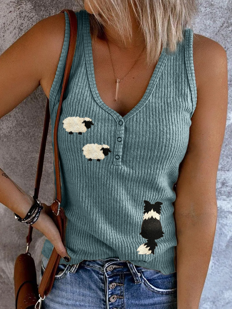 Border Collie & Sheep Embroidered Button Up Tank Top