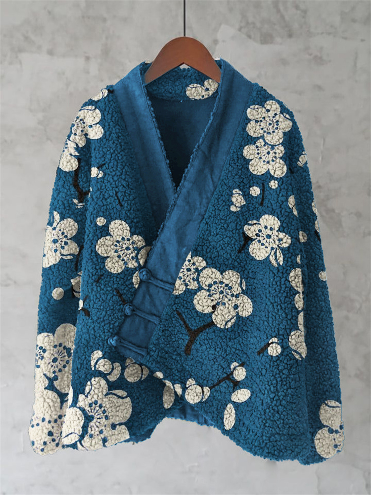 Cherry Blossom Japanese Lino Art Cozy Fleece Kimono Cardigan