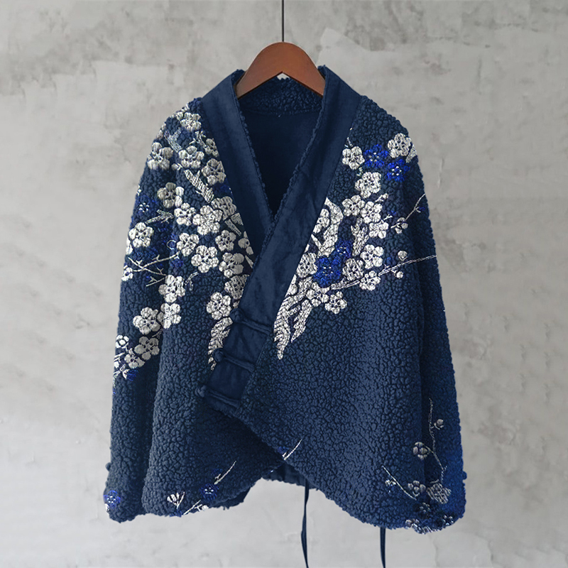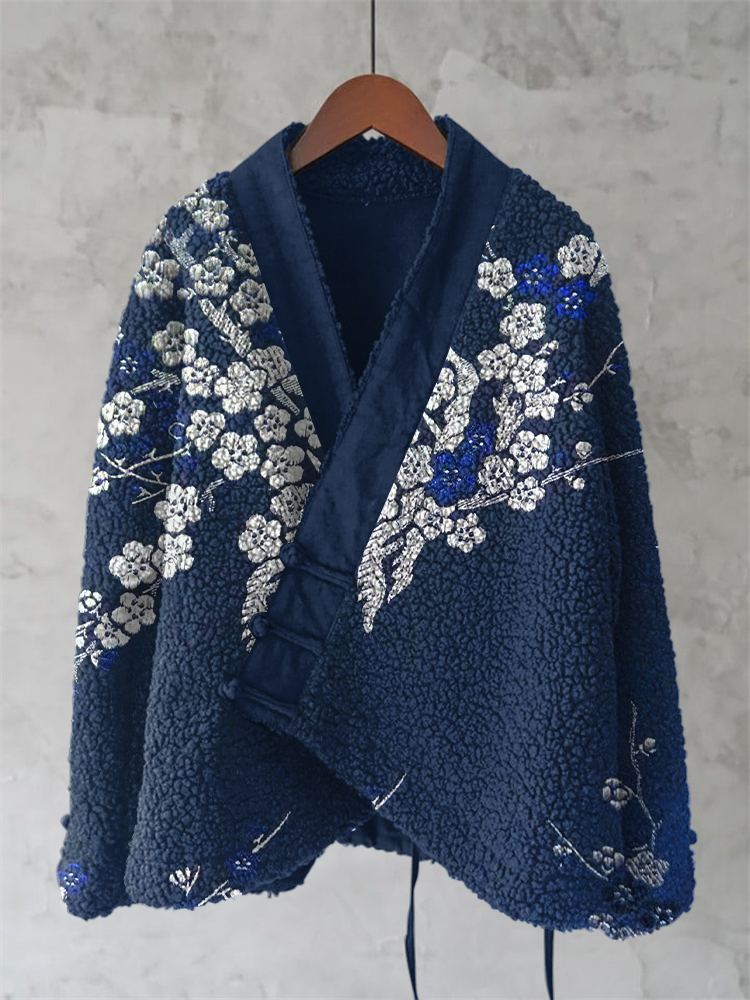 Japanese Floral Lino Art Cozy Fleece Kimono Cardigan