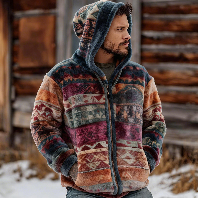 Men's Retro Tribal Geometric Print Plush Zip-up Hoodie