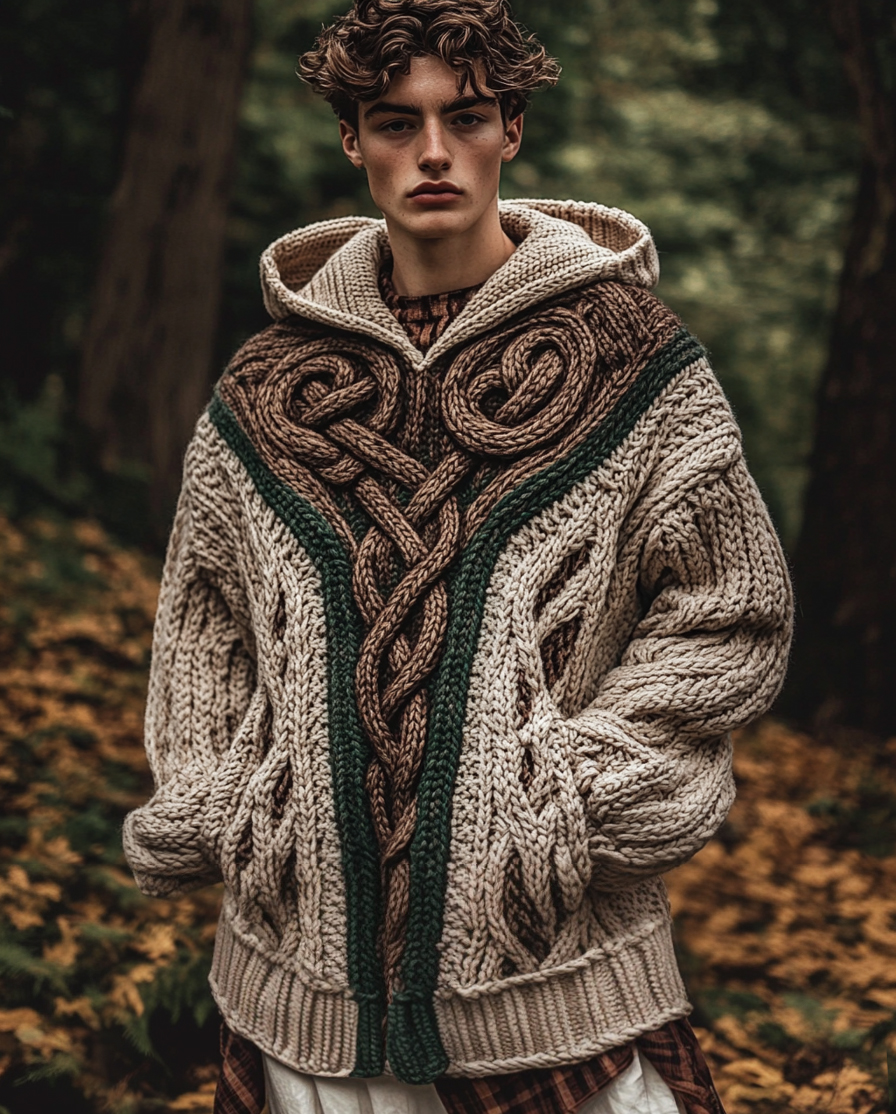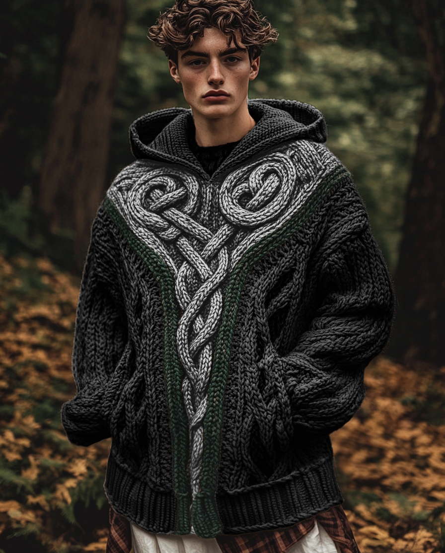 Men's Vintage Irish Celtic Knot Jacquard Mottled Hooded Sweater