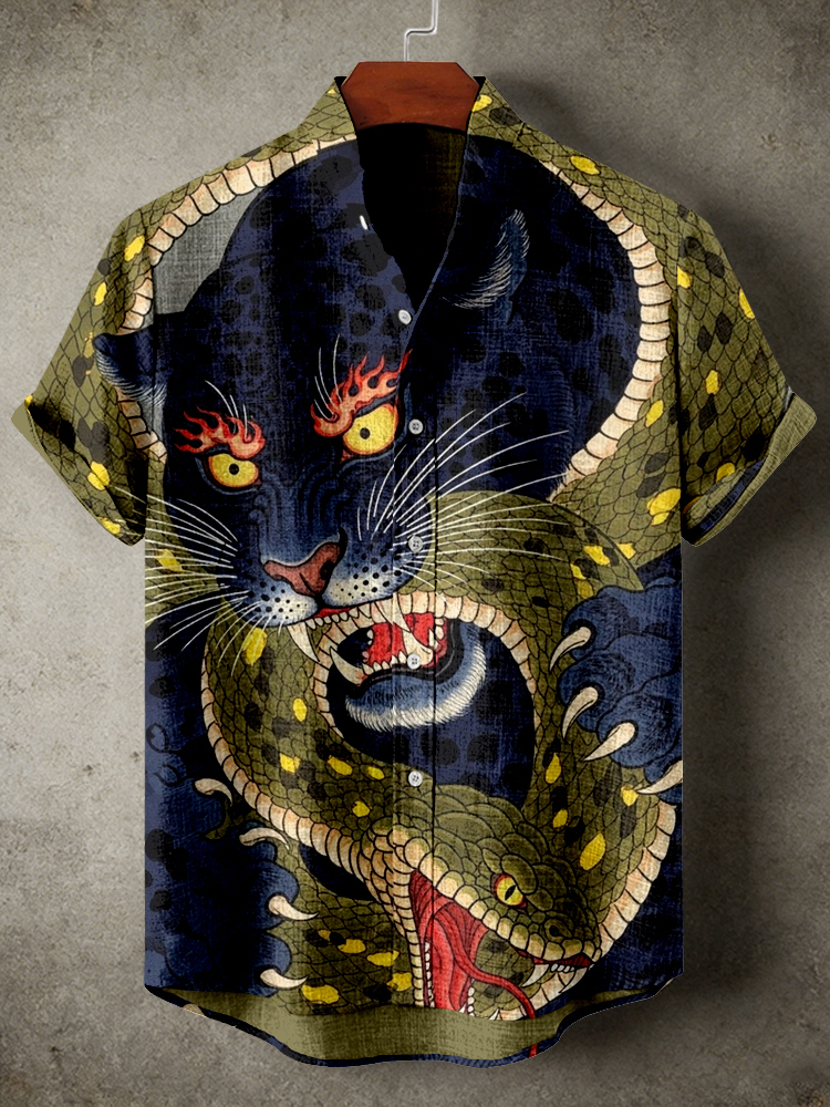 Retro Japanese Tiger & Snake Art Linen Shirt