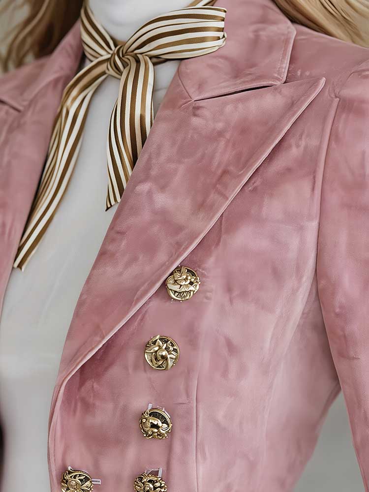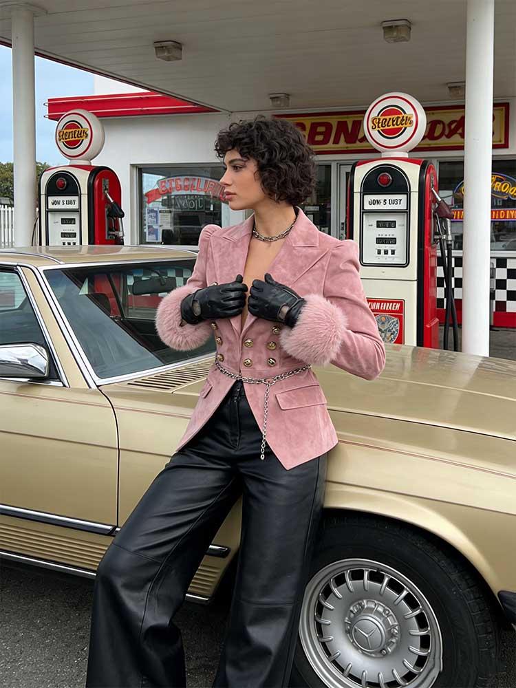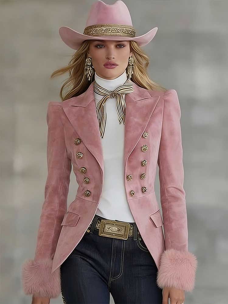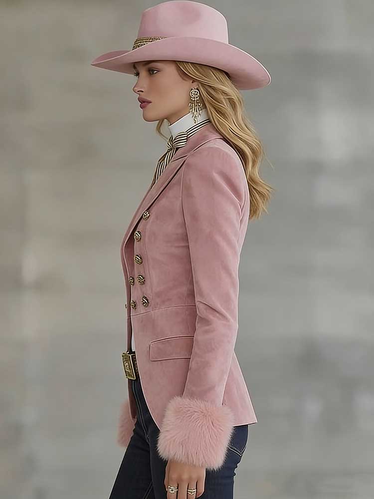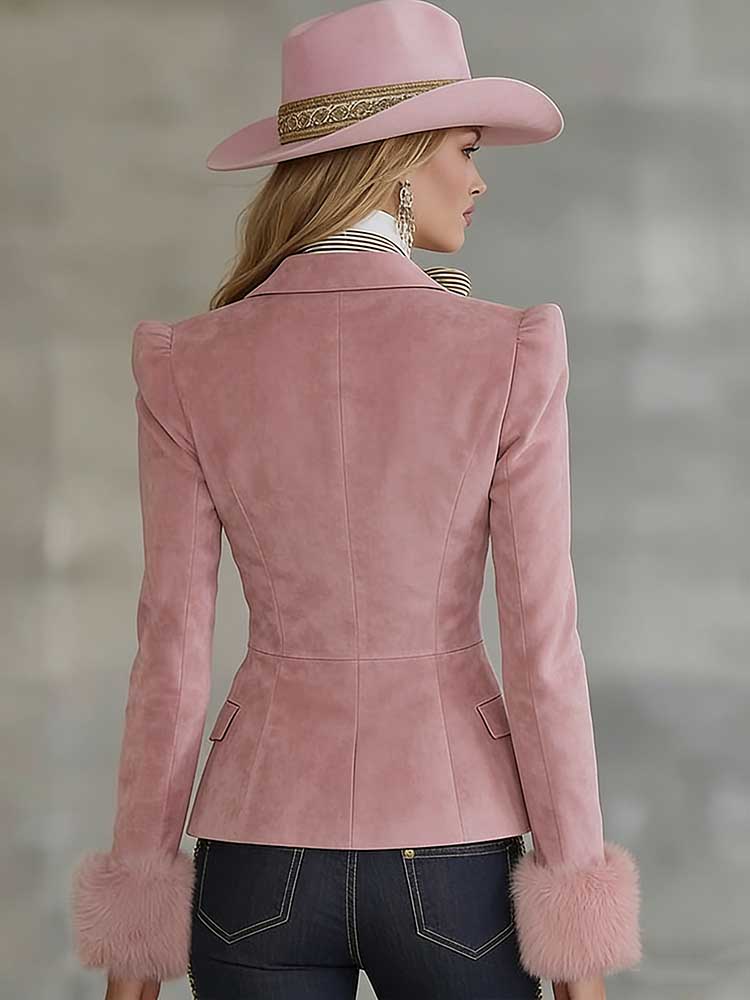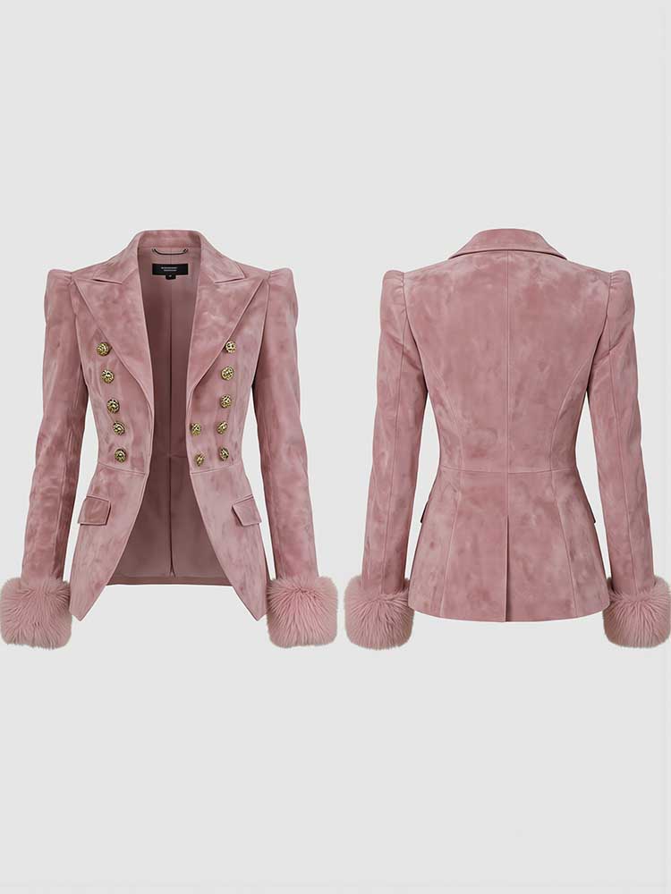 Retro Slim Fit Fur Trim Suede Suit Jacket