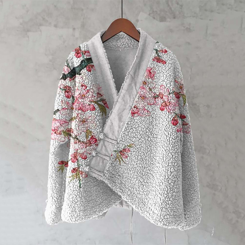 Vintage Ink And Wash Floral Art Cozy Fleece Kimono Cardigan