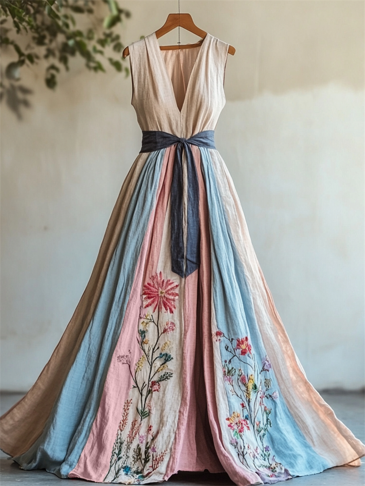 Floral Embroidered Transgender Colorblock Linen Maxi Dress