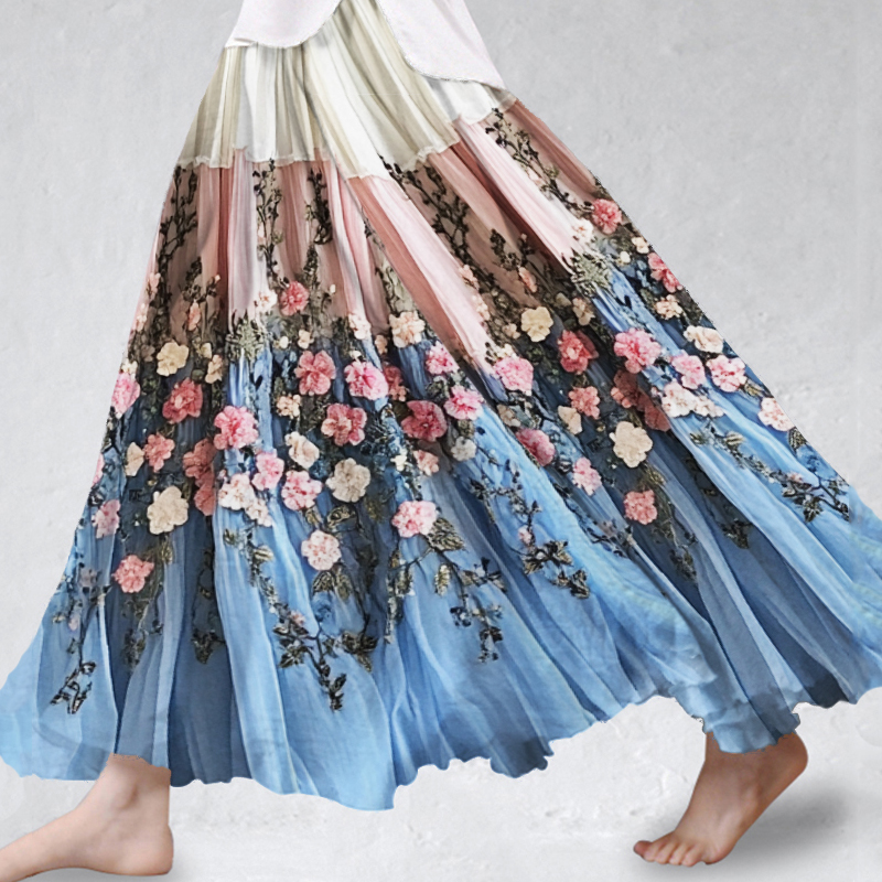 Floral Embroidered Transgender Colorblock Flowy Wide Skirt