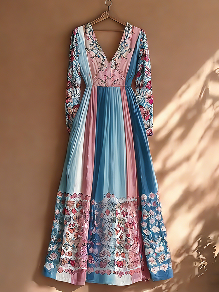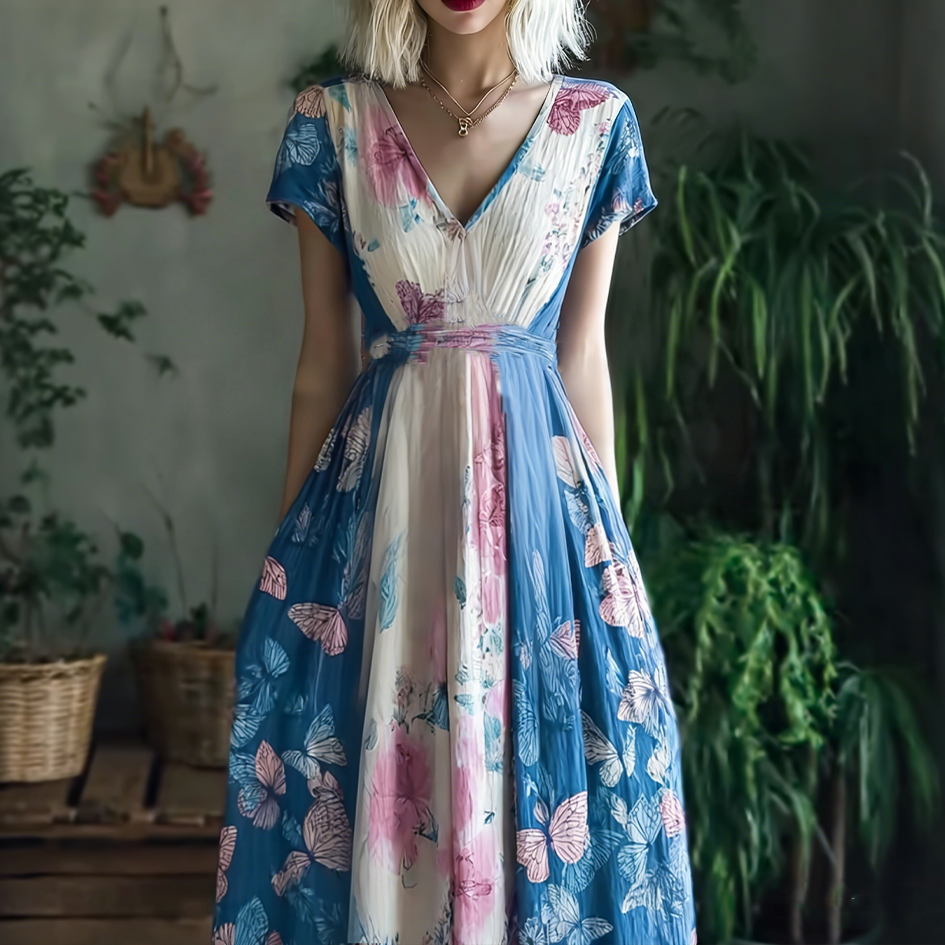Retro Butterfly Print Transgender Colorblock Patchwork Dress