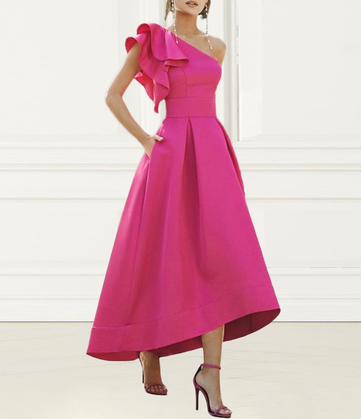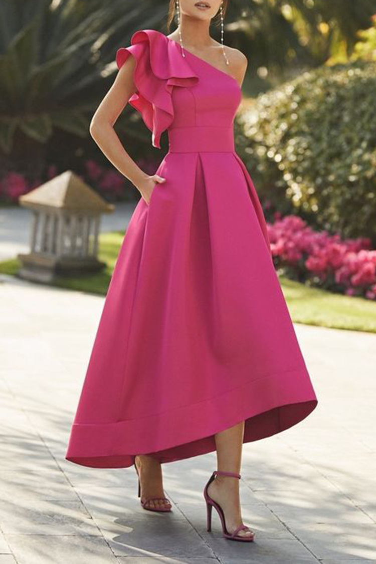 Elegant One Shoulder Ruffle Sleeve A Swing Midi Dress
