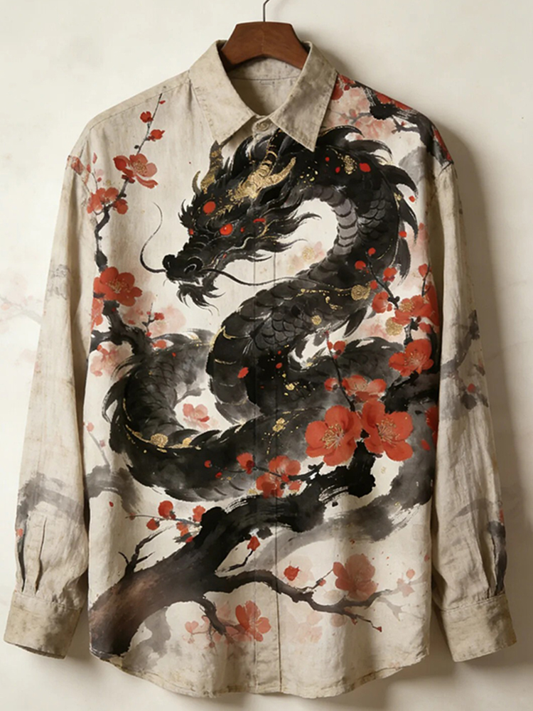 Men's Ink Painting Dragon Flower Print Long Sleeve Shirt