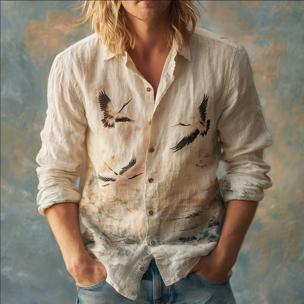 Men's Japanese Crane Retro Printed Linen And Cotton Collar Shirt