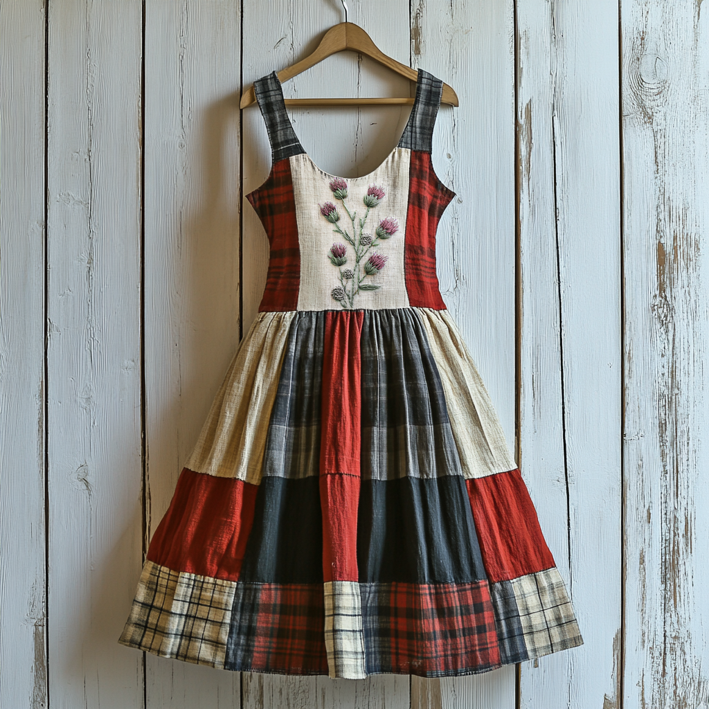Women's Scottish Thistle Plaid Patchwork Art Linen Mini Dress