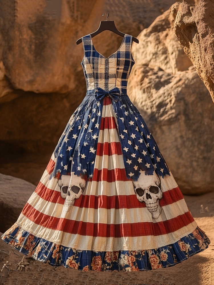 Women's Independence Day Skull And Plaid V-neck Long Dress