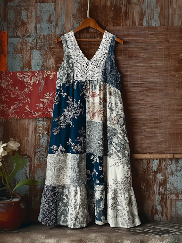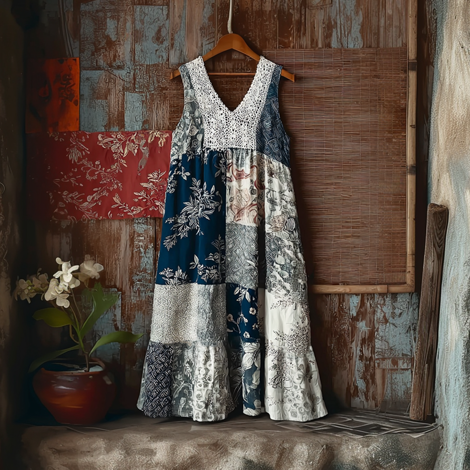 Japanese Art Retro Style Geometric Patchwork Design Lace Patch Women's Cotton And Linen Dress
