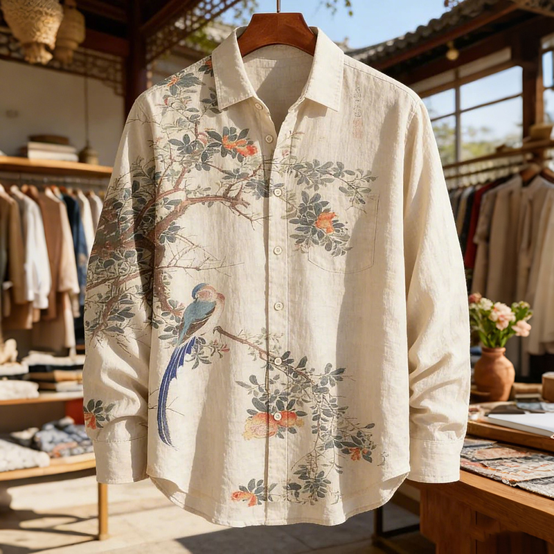 Men's Vintage Tree Bird Art Painting Print Long Sleeve Shirt