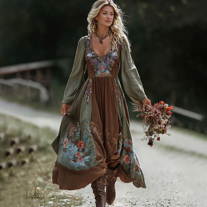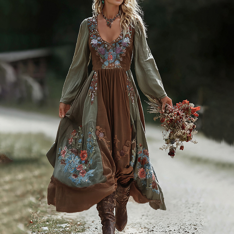 Retro Boho Linen Ethnic Art Loose Maxi Dress