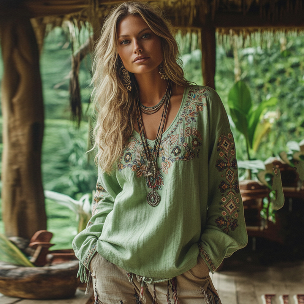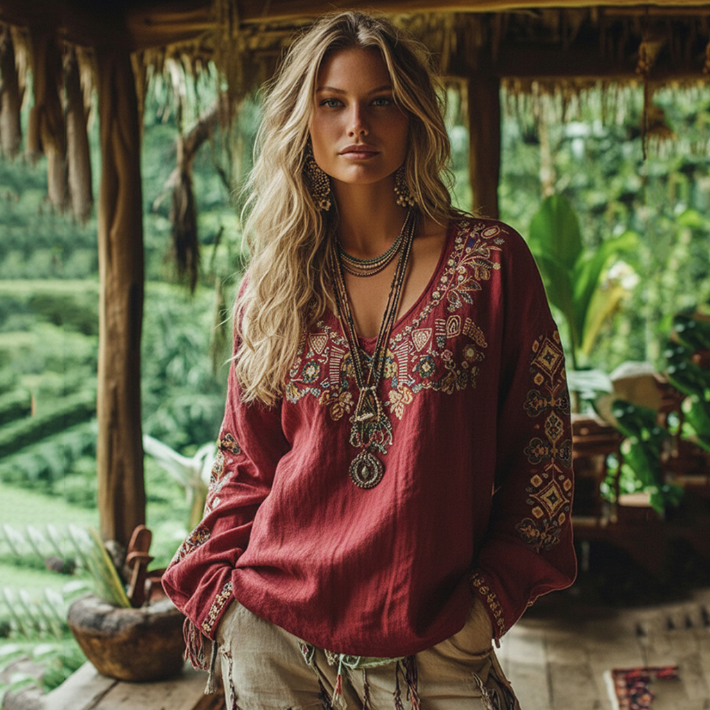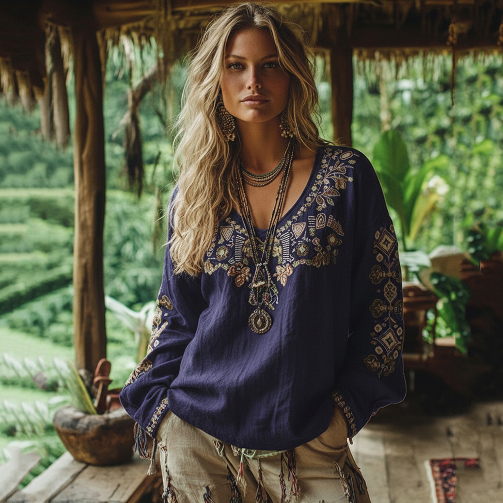 Retro Boho Tribal Floral Embroidery Print Cotton And Linen Blend Loose Blouse