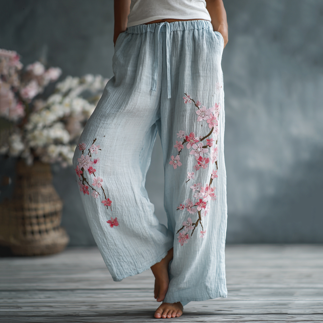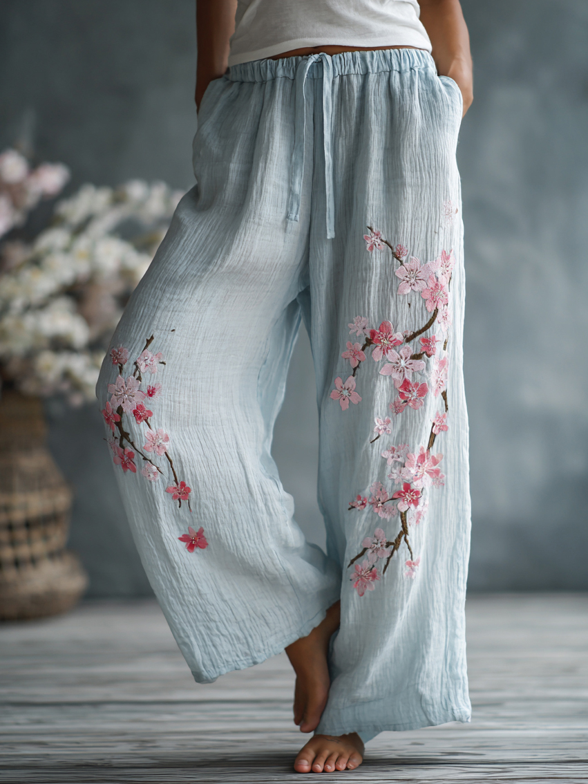 Women's Japanese Floral Pattern Linen Pants