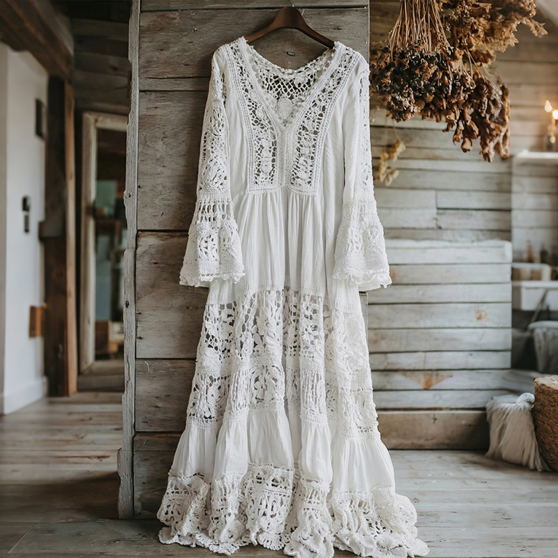 Women's Lace Floral Pattern V-neck Long Sleeve Midi Dress