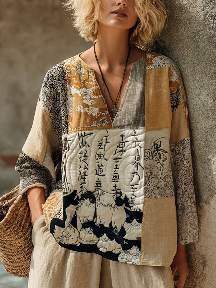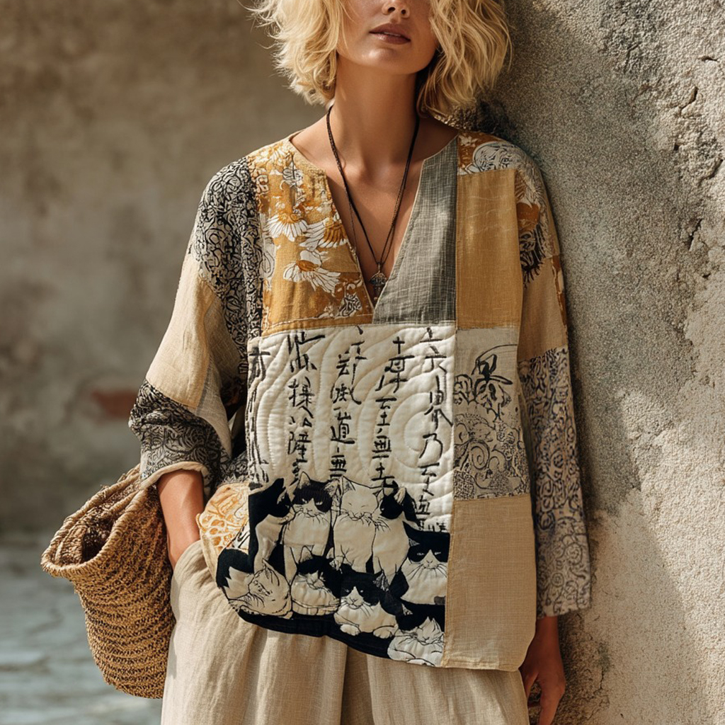 Women's Retro Cat With Japanese Patchwork Art Print Comfy Top
